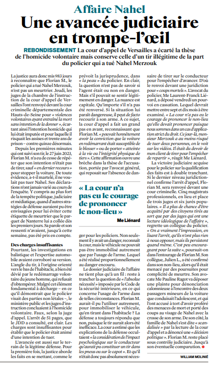 « Florian M. avait pu avoir la conviction qu’en redémarrant, la Mercedes était susceptible de porter atteinte à l’intégrité physique de tiers ou à la sienne », a-t-elle ajouté dans un communiqué. La cour d’appel a par ailleurs confirmé le non-lieu pour le second policier présent lors de l’intervention. « S’agissant de mon client, la cour a décidé qu’il n’y avait pas d’intention d’homicide, c’est-à-dire qu’il n’a pas essayé de tuer Monsieur Nahel Merzouk », a réagi Laurent-Franck Liénard, avocat du policier auteur du tir. « La cour n’a pas eu le courage de prononcer le non-lieu qu’elle devait prononcer puisque nous sommes dans un cas d’application stricte du droit et mon client n’a fait qu’appliquer la loi », a-t-il déploré. L’avocat a par ailleurs annoncé qu’il allait « certainement saisir la Cour de cassation ».